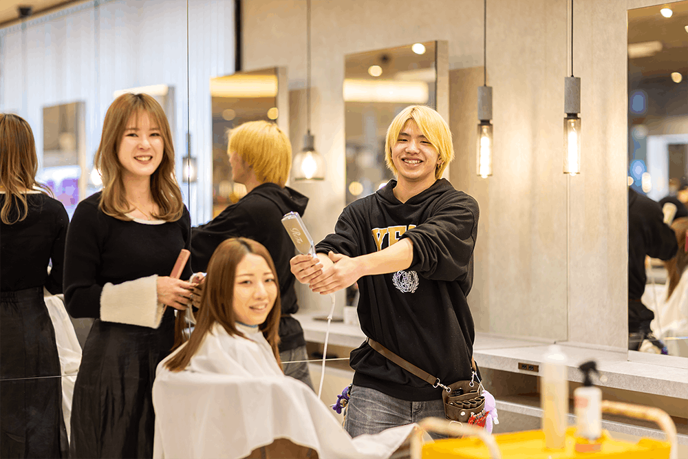 「優しい先輩たちから実践技術を学べるのがうれしい。お客さまの思いを引き出すスタイリストを目指す」と話します。